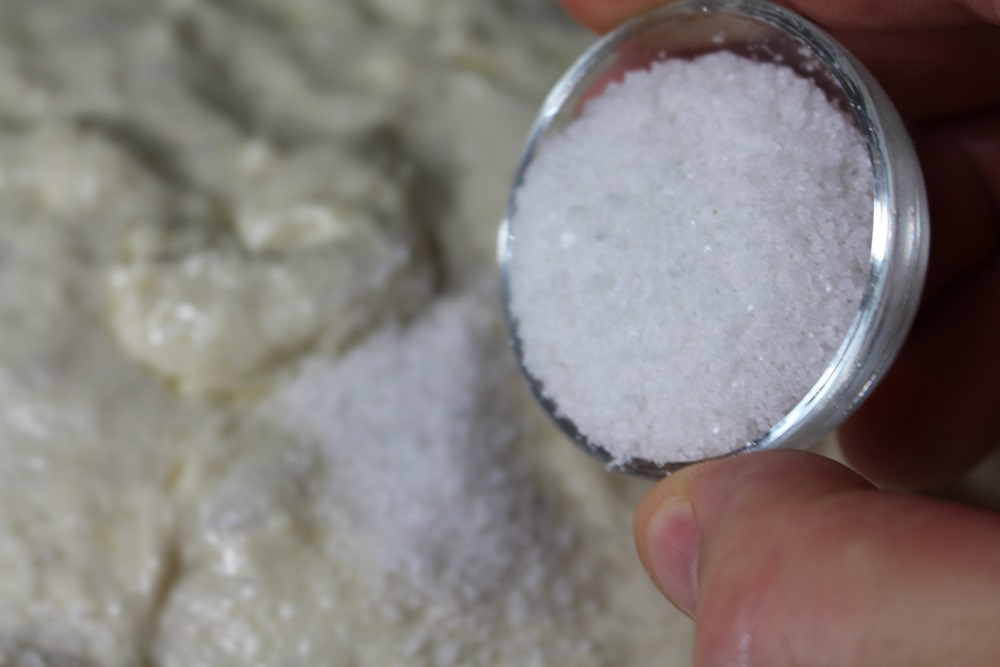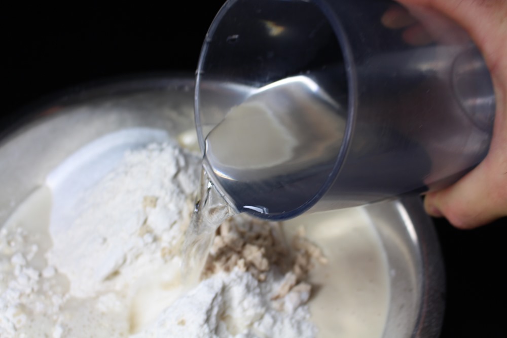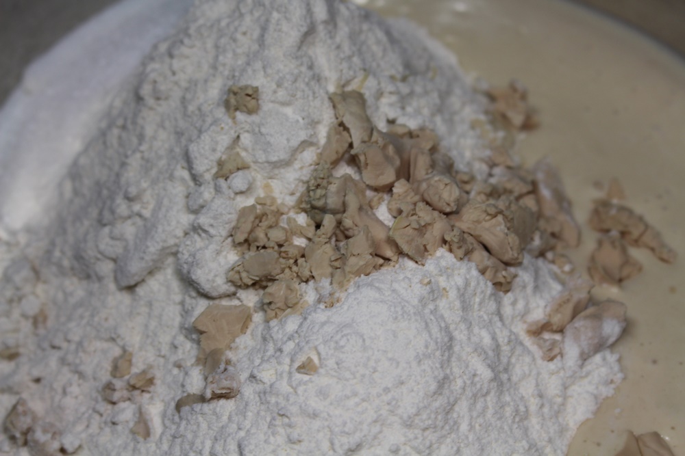 Egy dagasztóedénybe teszem a lisztet, az élesztőt, a cukrot, a vadkovászt.