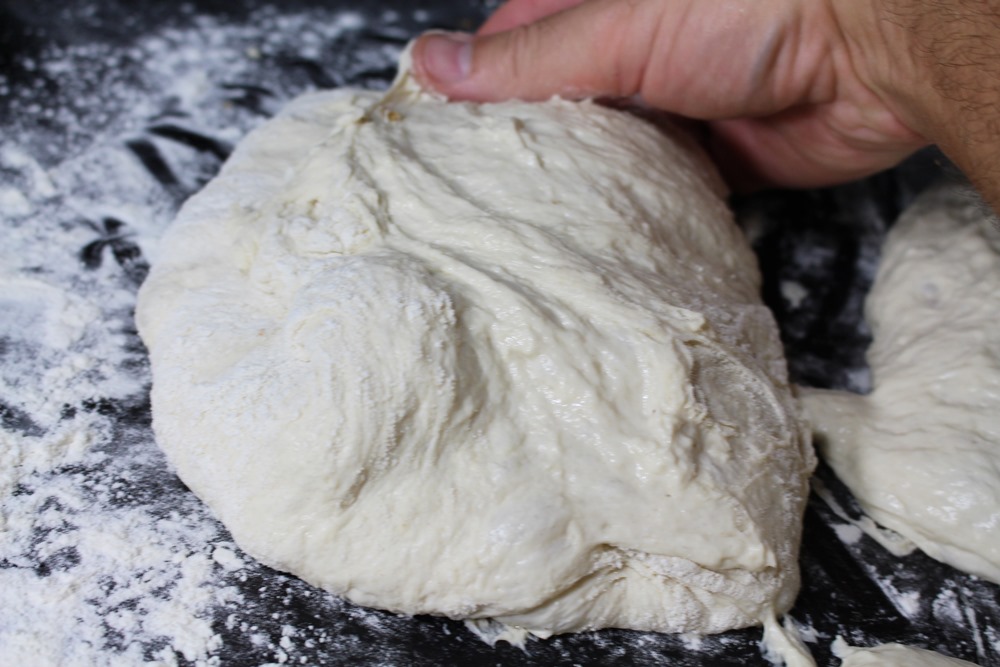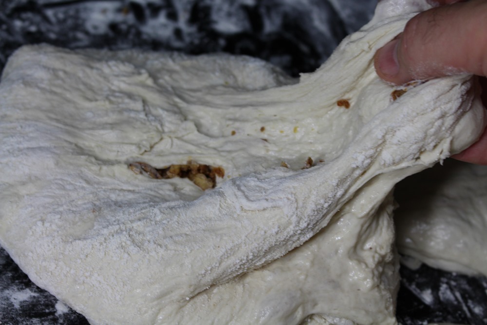 Duplájára kelesztem, 4 oldalról meghajtogatom a tésztát, ezt összesen háromszor ismétlem meg, 30-40 perces kelesztési időkkel a hajtások között.