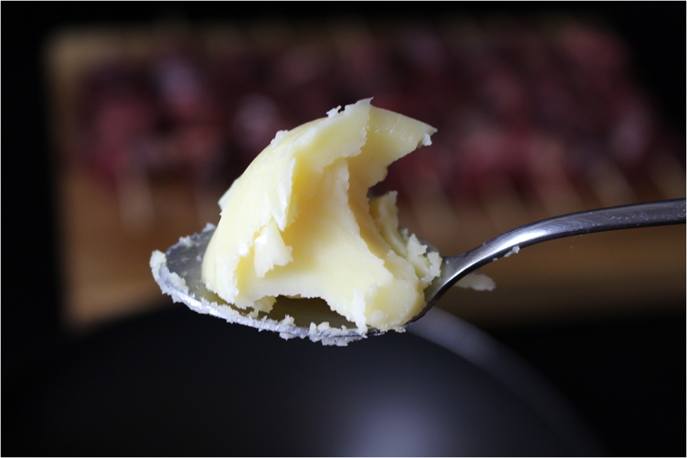 Egy serpenyőben felforrósítom a borjúfaggyút.
