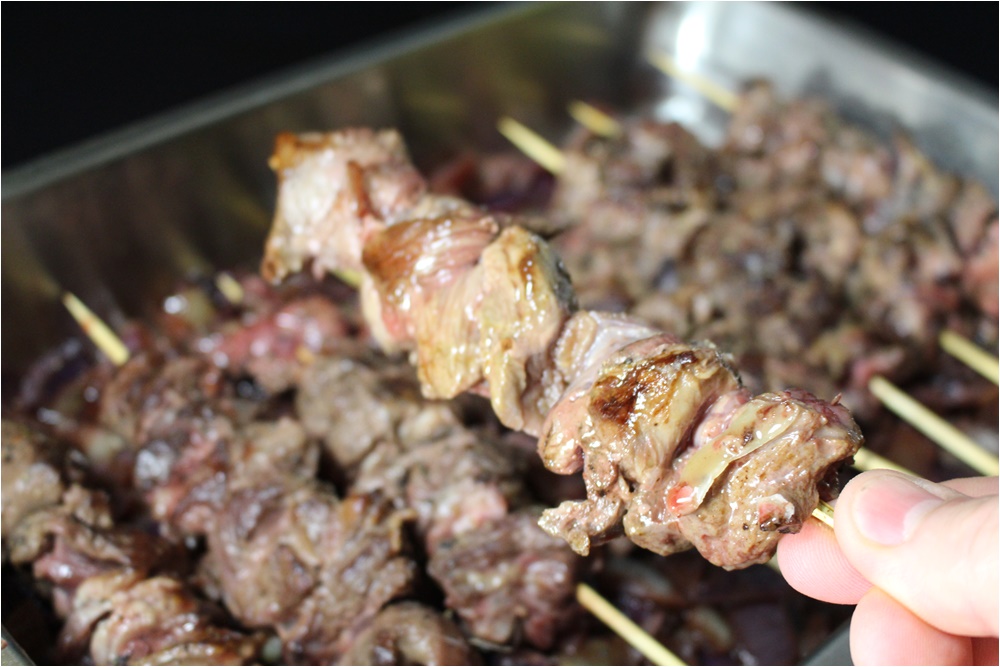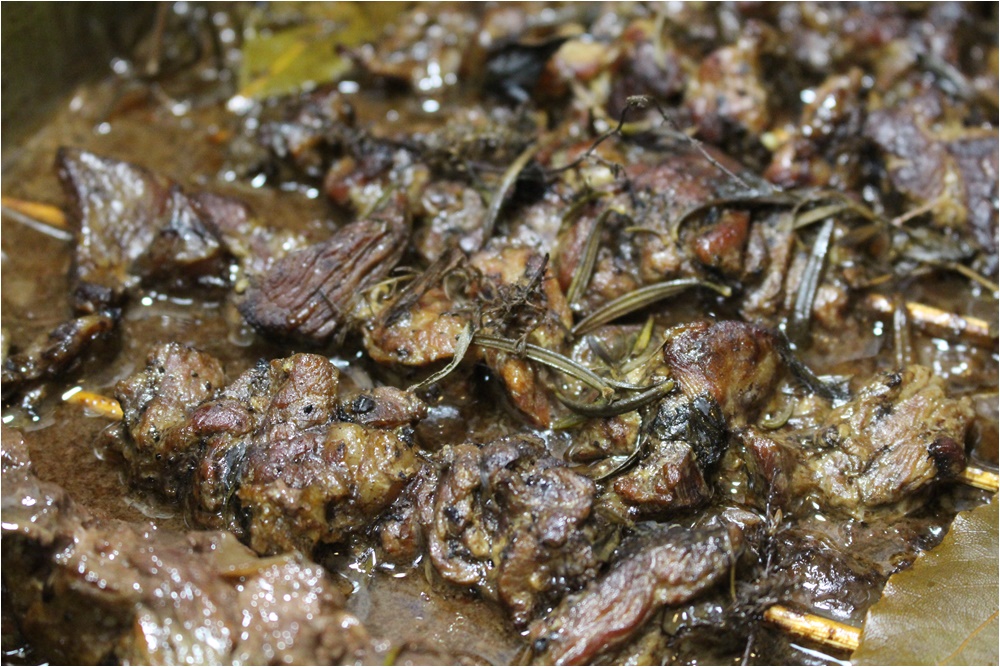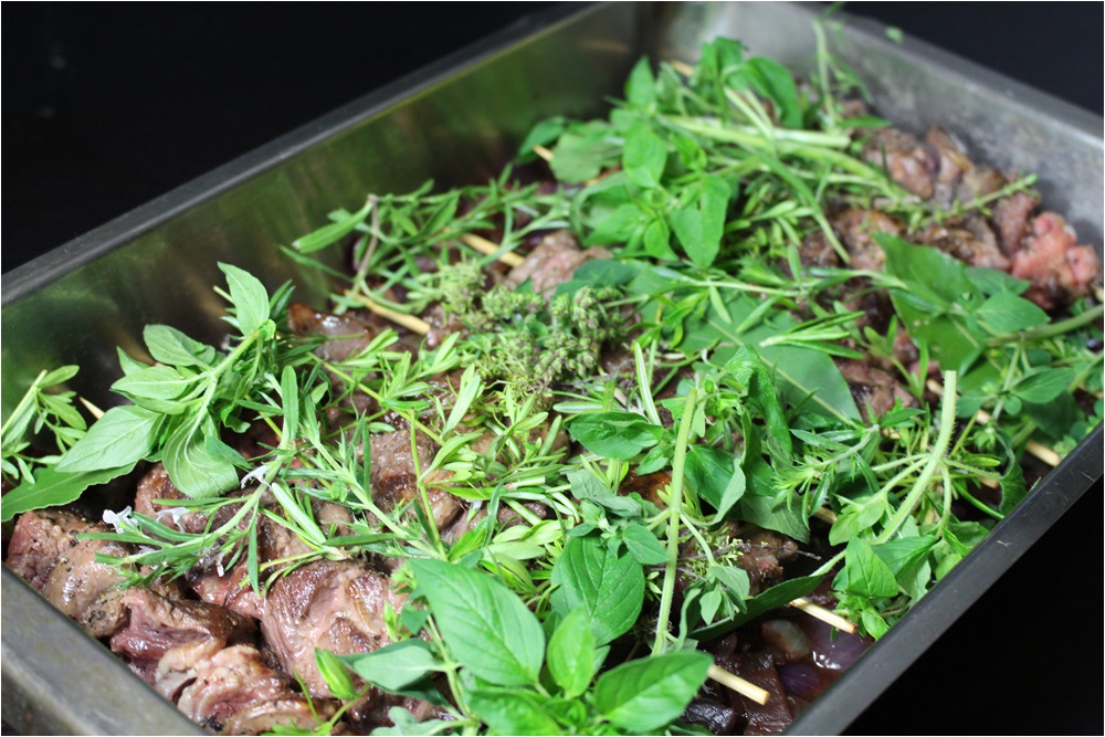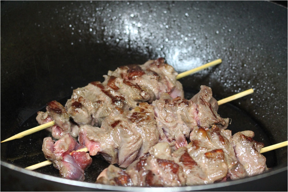 A szarvas apróhúst felfűzöm a bambusznyársra.