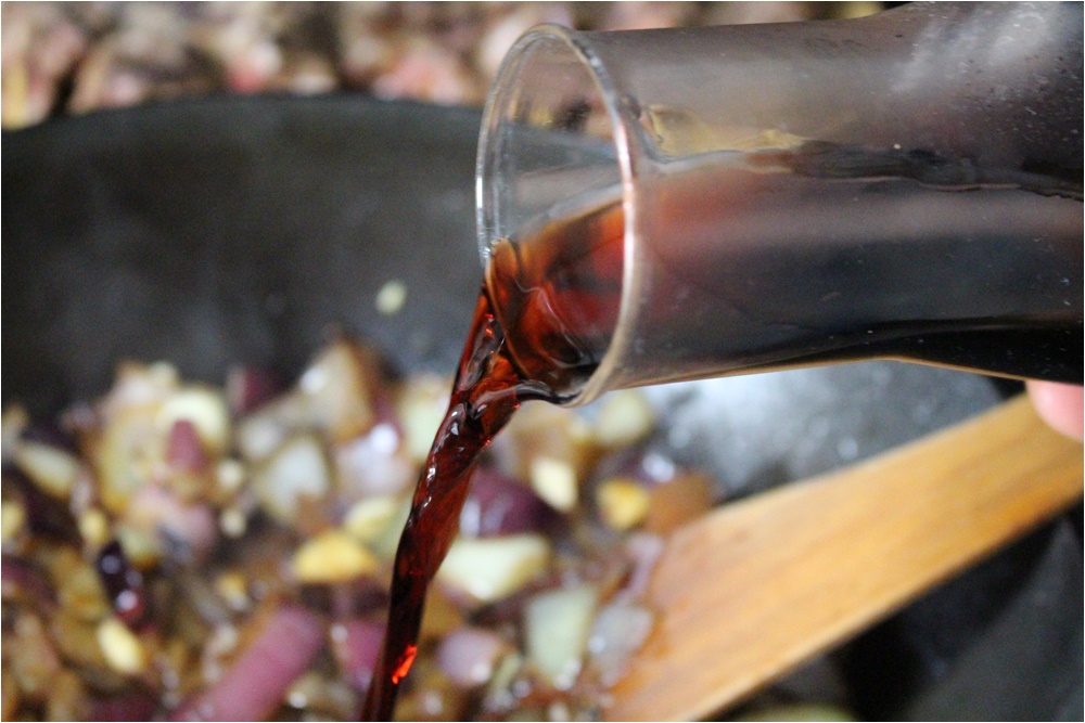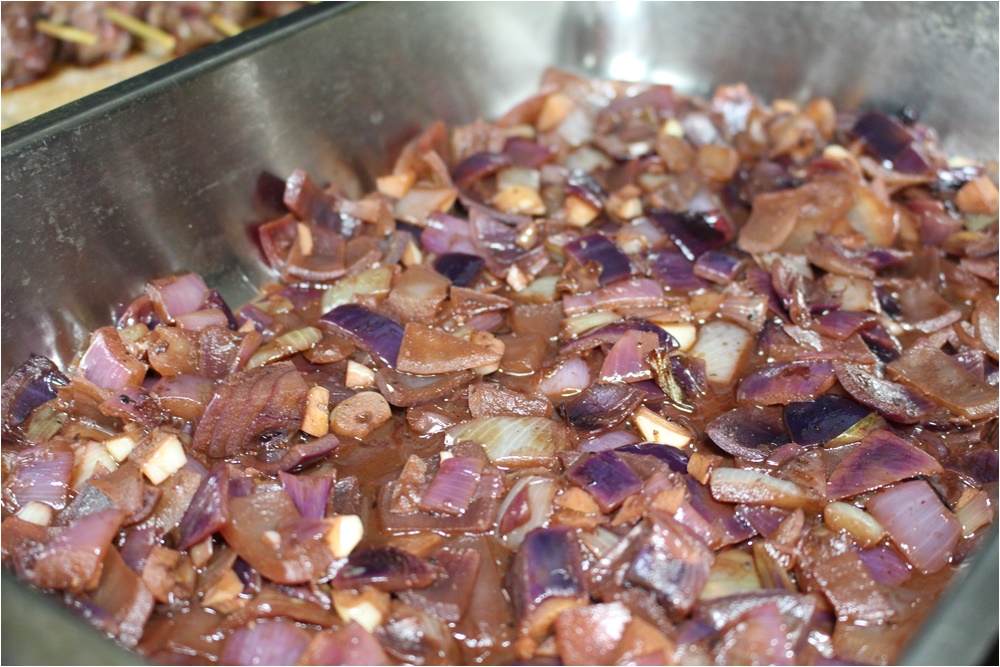 A vörösborral összeforralt, enyhén lepirított hagymát egy tepsibe öntöm.