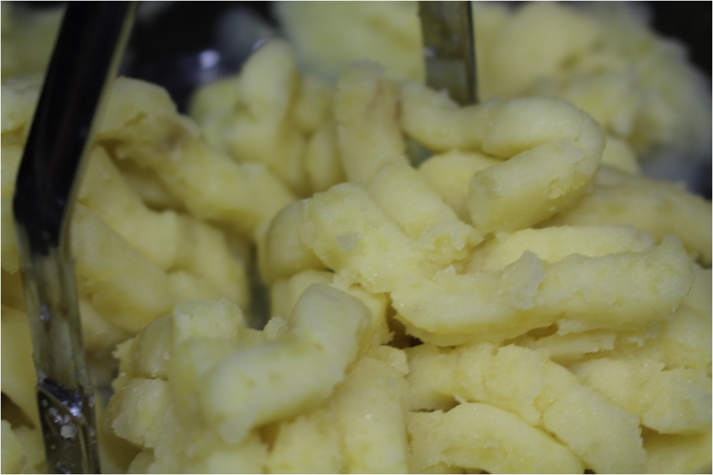 Elkészítem a burgonyafánkot. A főtt burgonyákat áttöröm.