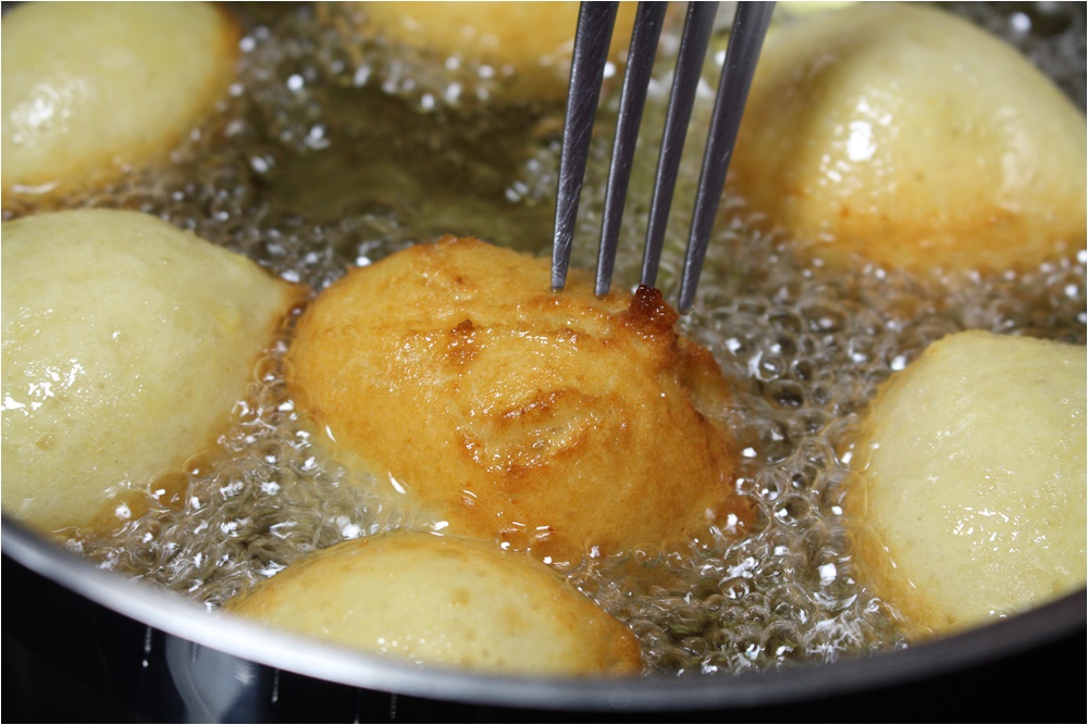 Közepesen forró olajban megsütöm a fánkocskákat, maguktól megfordulnak a sütési idő felénél. Az olajból kiszedve, papírtőrlőre téve lecsepegtetem.