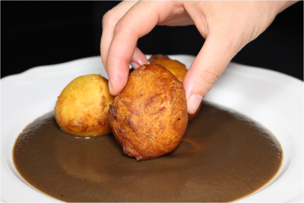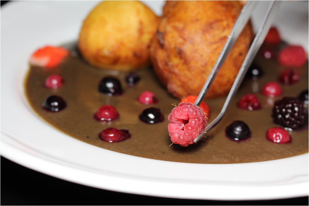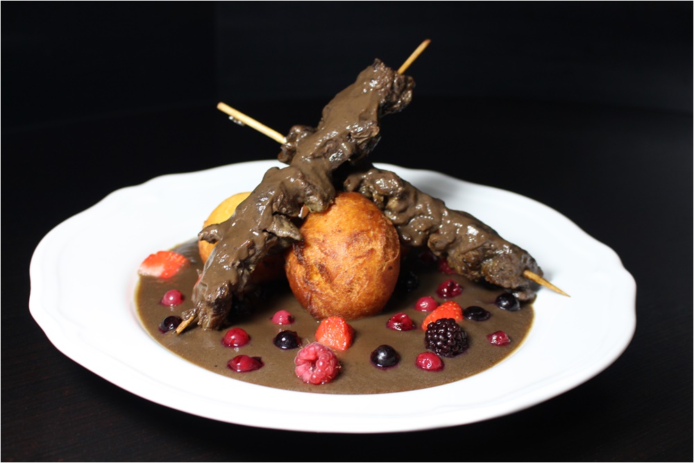 Így készíthetünk szarvas apróhúsból, melyből többnyire pörkölt vagy valamiféle ragú lesz, jóval elegánsabb fogást. A bambuszpálcikákra felfűzöm a húskockákat, elősütöm azokat borjúfaggyún. Hagymával és vörösborral készítem tovább a sütőben, 120 fokon, 3-4 óra alatt. Vadkovásszal készült fánkocskákkal, saját mártásával tálalom, melybe erdei gyümölcsöket szórok. Készítsétek el Ti is!