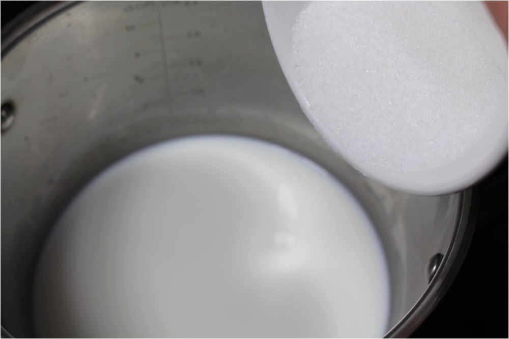 Elkészítem a csokoládés krémet. A cukrot a tejbe öntöm és felforralom.