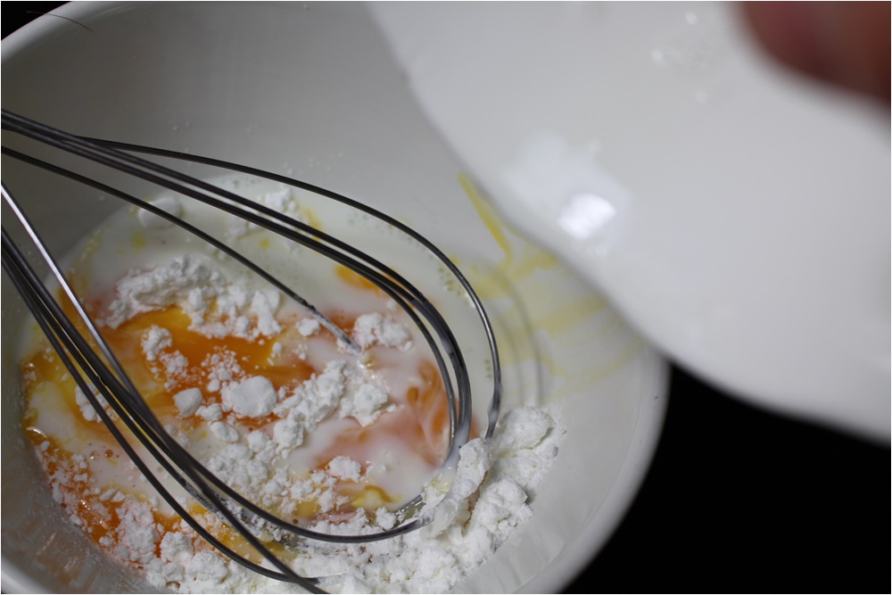 Összekeverem a tojássárgákat, a keményítőt és a tejet.