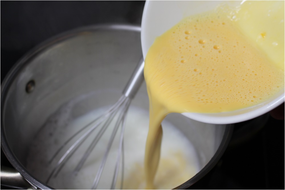 A vajat is a forró krémbe dobom, és addig keverem míg teljesen el nem oszlik benne.