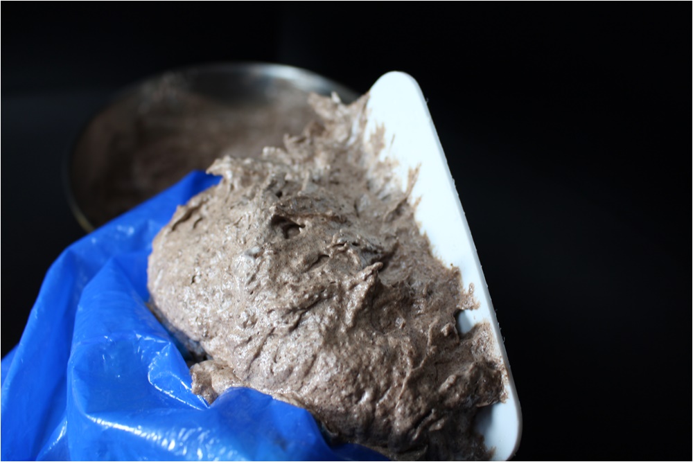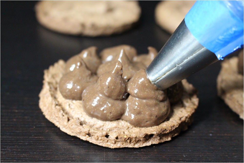 Nyomózsák segítségével alakítom ki az alsó piskótarétegen a csokoládékrém félgömböcskéket.