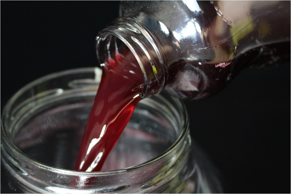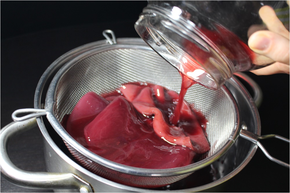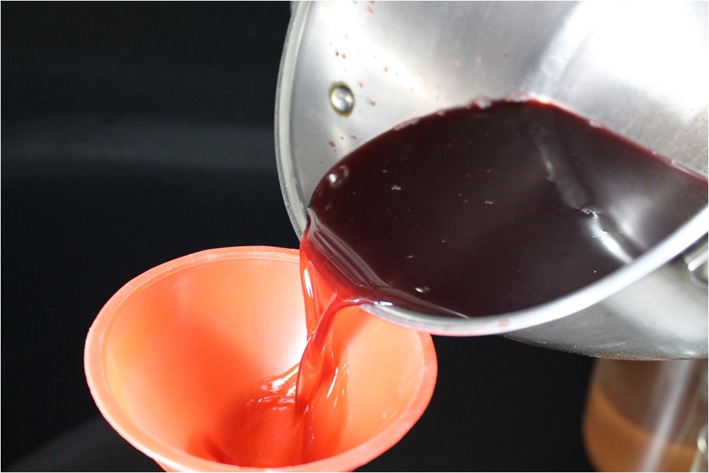 Hőkezeléssel sterilizált üvegekbe töltöm a kész feketeribizli ecetet.