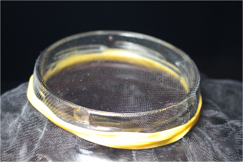 A befőttes üveg tetejét műanyag tüllel fedem, amit erős gumival rögzítek rajta. Nagyon fontos hogy megóvjam az ecetemet a rovaroktól.