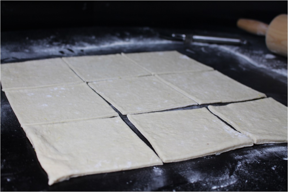 5-6 milliméter vastagra nyújtom a tésztát, és egyforma négyzeteket vágok belőle.