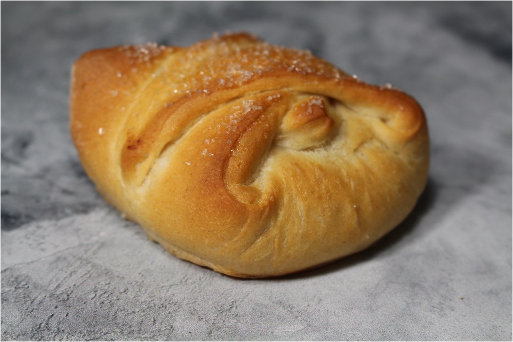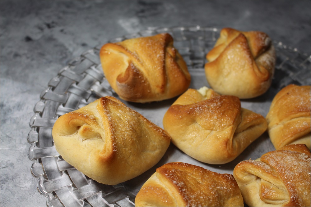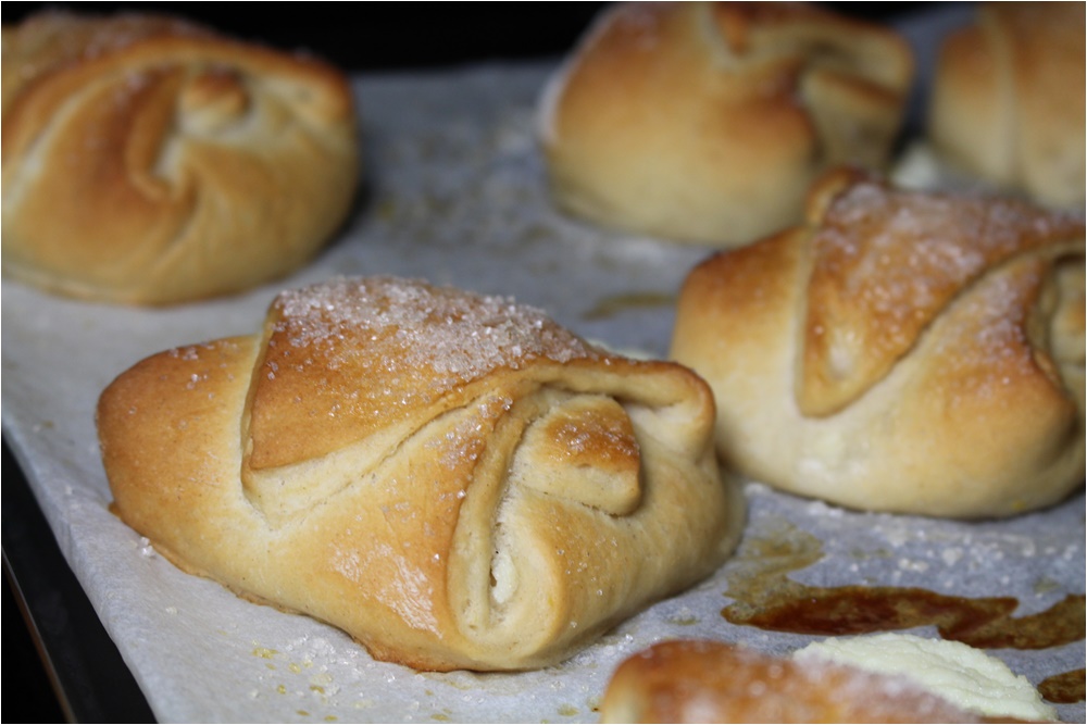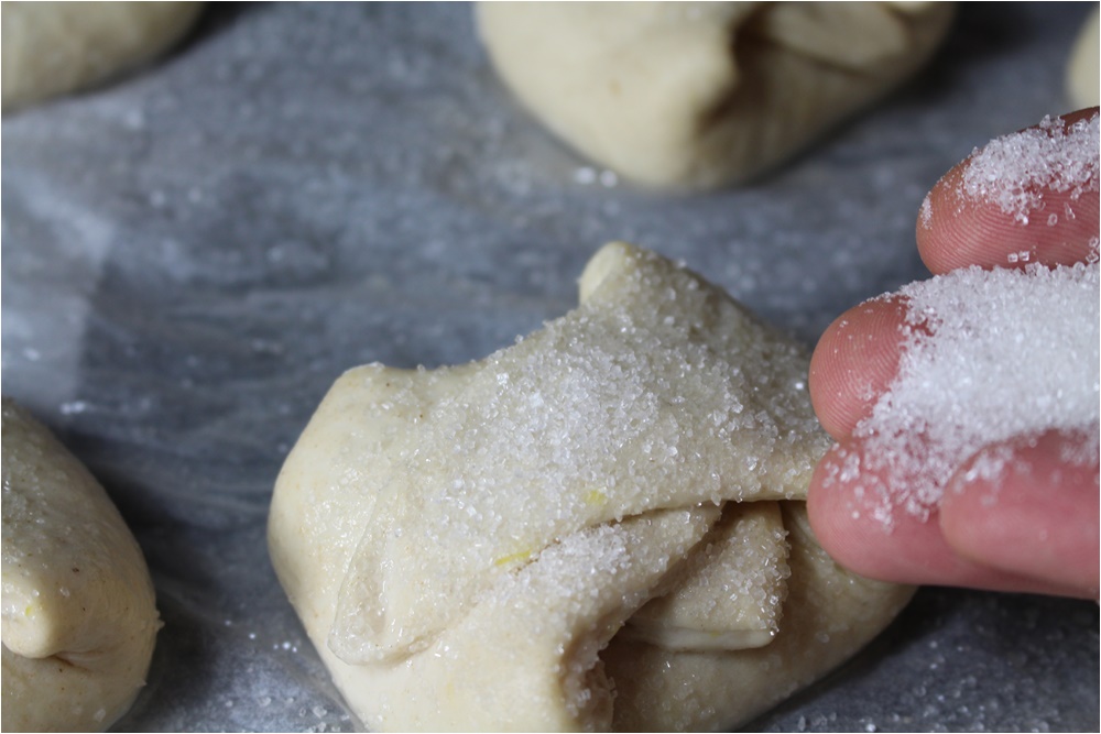 Sütés előtt kevés kristálycukorral hintem meg a nedves tésztafelületet.
