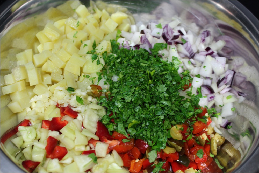 Közepes kockára vágom a zöldségeimet és rászórom a frissen vágott petrezselyemzöldet.