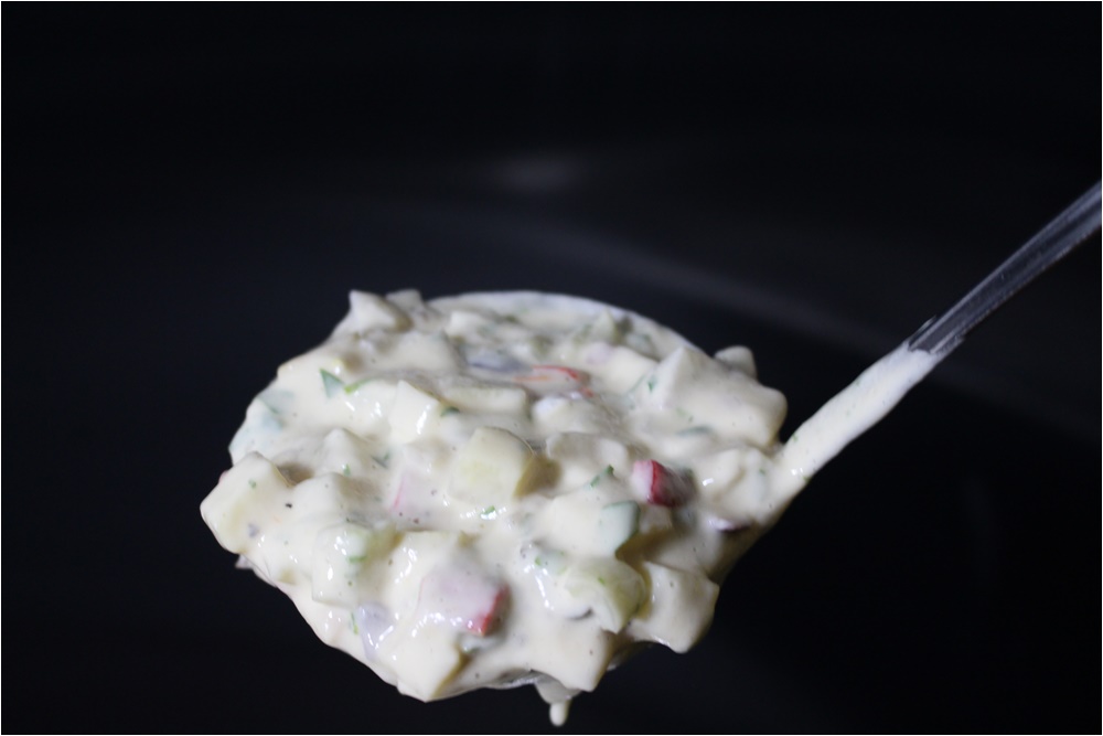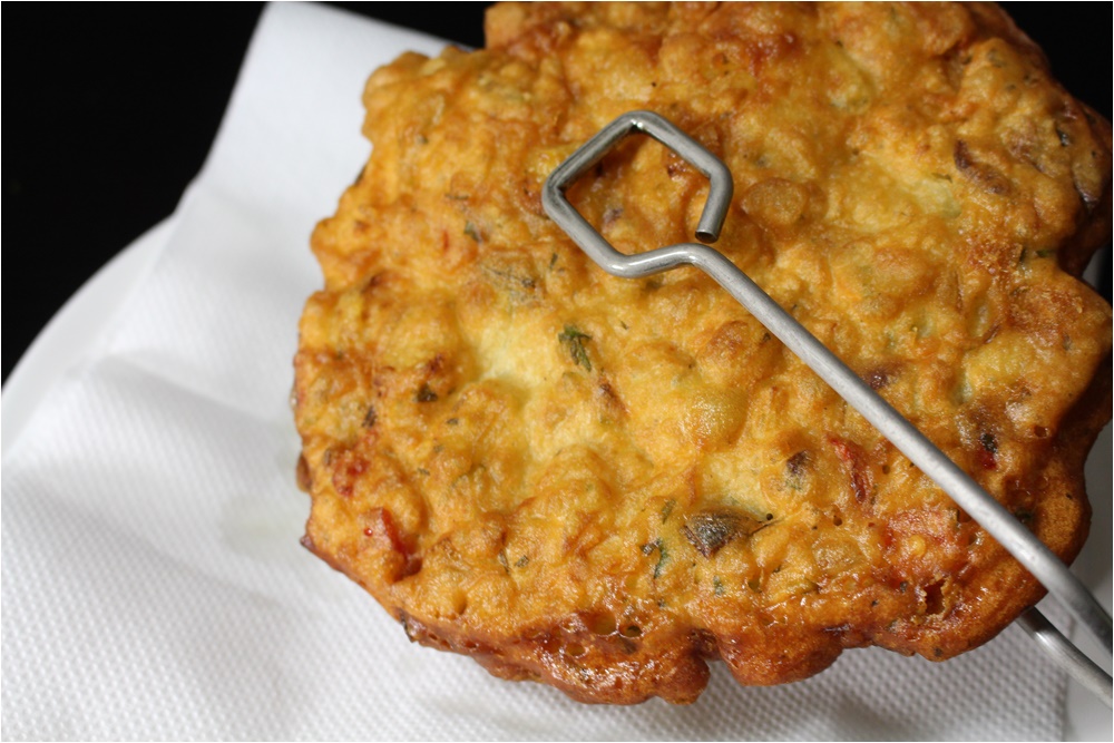 Már tálalhatok is. Egy kisebb hegyet rakok az Orly falatokból, mellé a mártogatásra szolgáló sűrű, kicsepegtetett joghurtot, melyet citromlével, citromhéjjal, sóval és különböző zöld fűszerekkel ízesítettem. Kívül ropog, belül levegősen lágy, mint egy fánk, a zöldségek állaga kellően ress maradt.