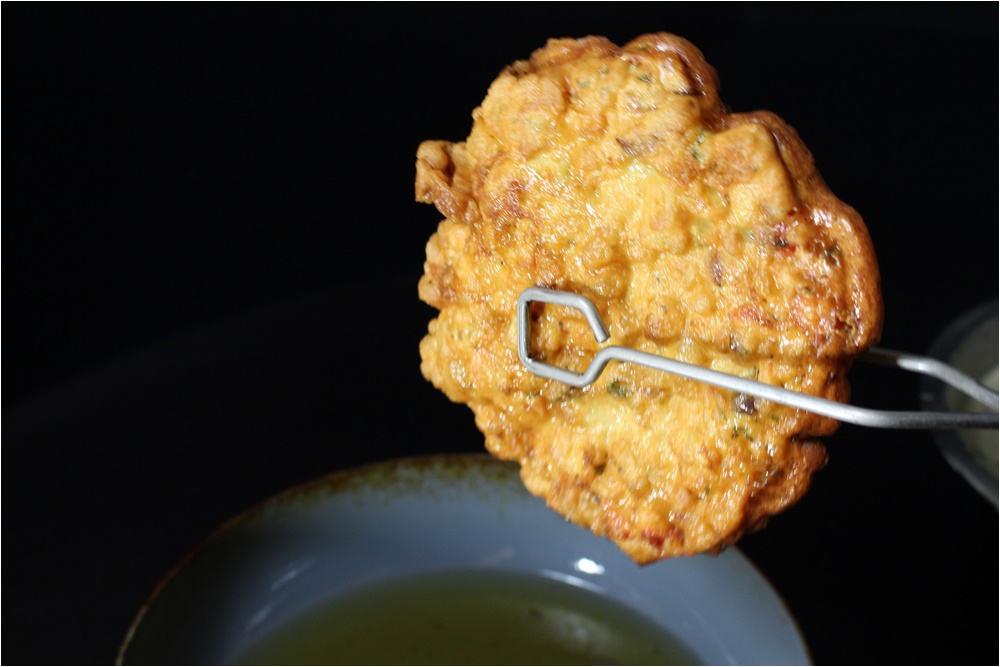 Egy kanál segítségével juttatom a zöldséges masszát a 170 fokos olajba.